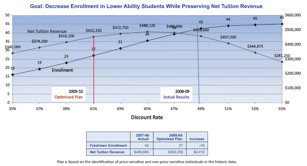 By reducing the number of lower quality students, a college can increase its average SAT score and look better in the rankings. This financial aid leveraging model enables colleges to test strategies interactively before a final plan is put in place.The net impact of these two plans is that the college has replaced 15 lower-ability students with 22 higher-ability students without significant negative impact on net tuition revenue.